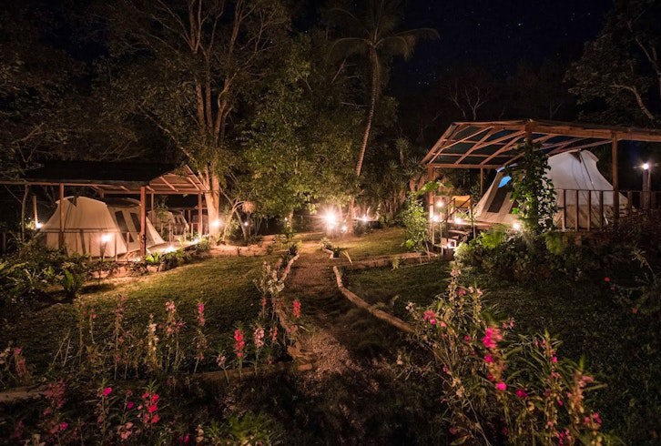Eight ample tents, raised off the ground on solid, covered platforms, surround you with the sights and sounds of the jungle while keeping you comfortable. Each tent feels like its own bungalow, with one king bed or two cozy twin beds, a night table, a rug, reading lamps, and even a small porch and garden. Stone-paved paths lead to shared bathrooms with unheated showers just a few steps away.